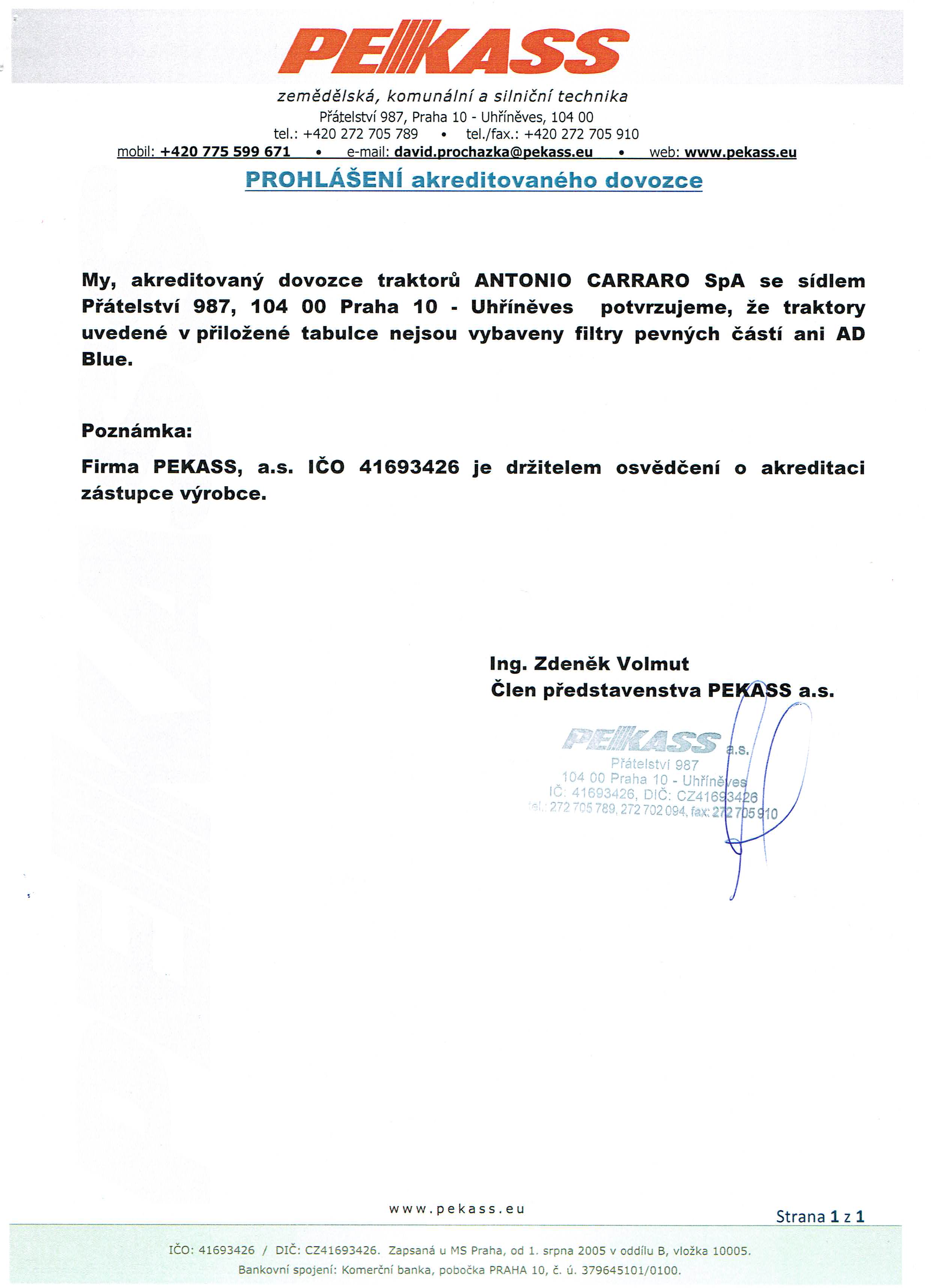 - prohlášení akreditovaného zástupce N+P PROFI s.r.o. k měření emisí kolových traktorů BRANSON (KUKJE)