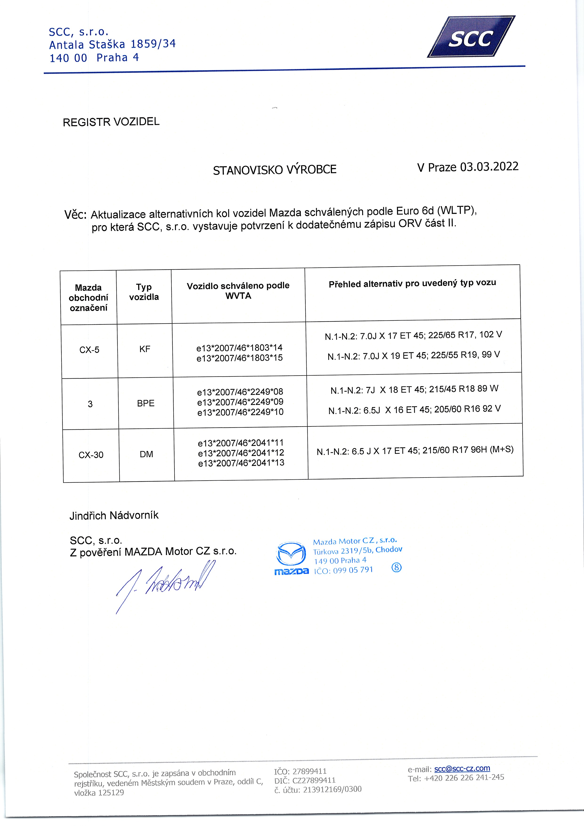 - Aktualizovaná informace o alternativních kolech vozidel MAZDA - 3/2022