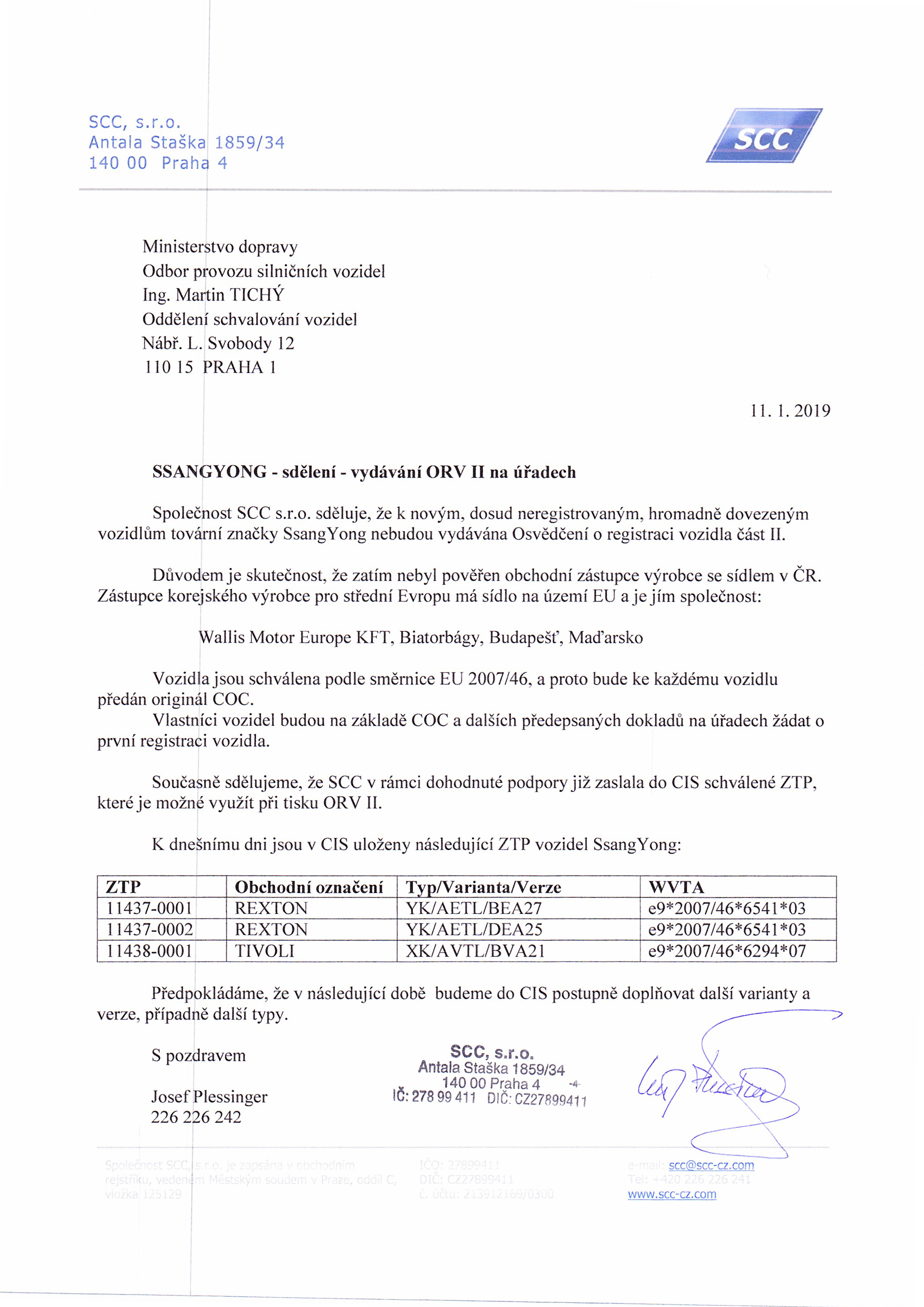 SSANGYONG - sdělení - vydávání ORV II na úřadech - 1/2019