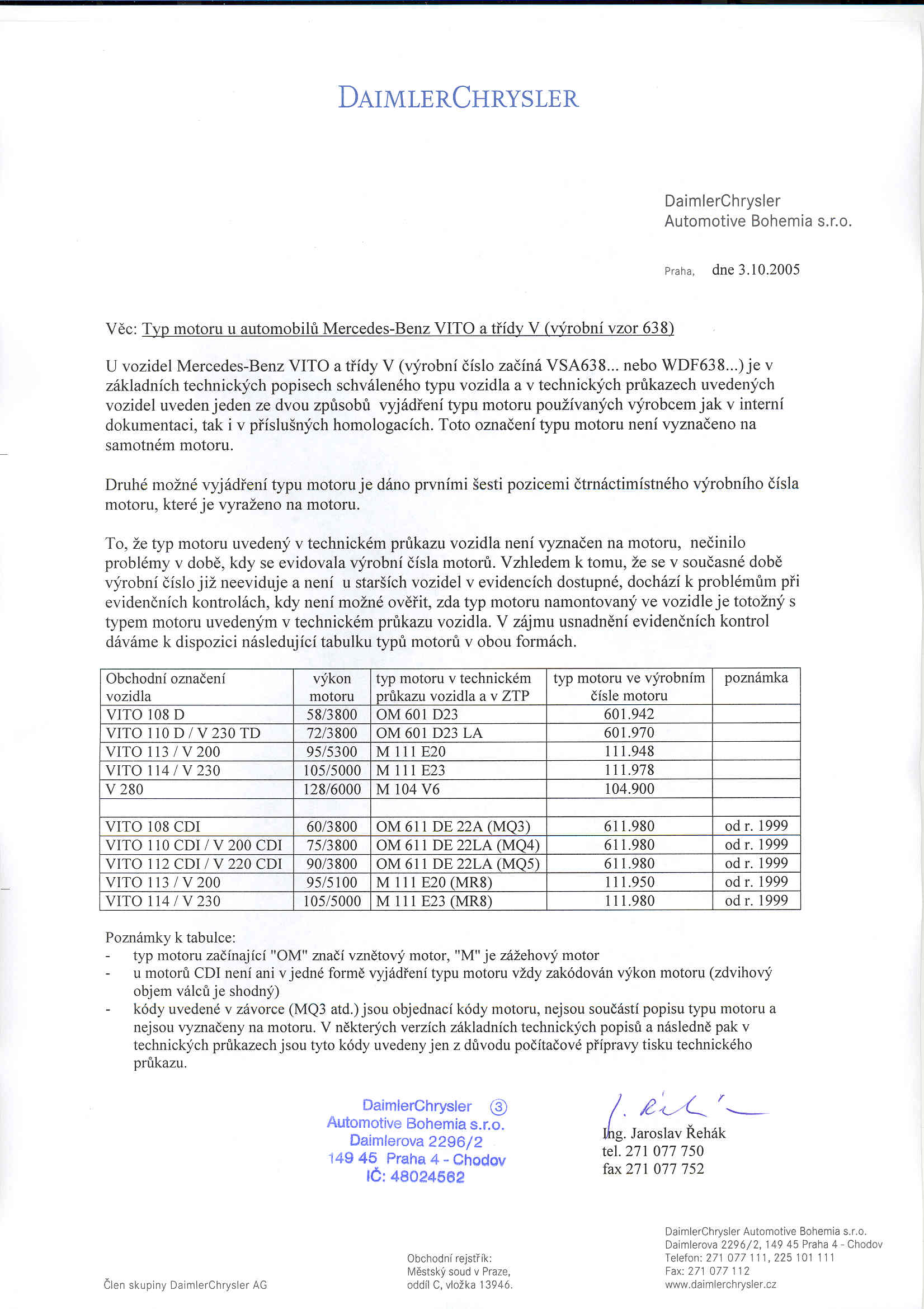 - Stanovisko k diferencím v označení čísel motorů u vozidel Mercedes-Benz Vito.